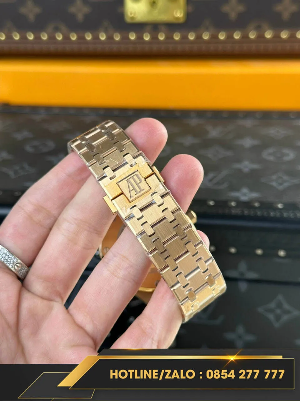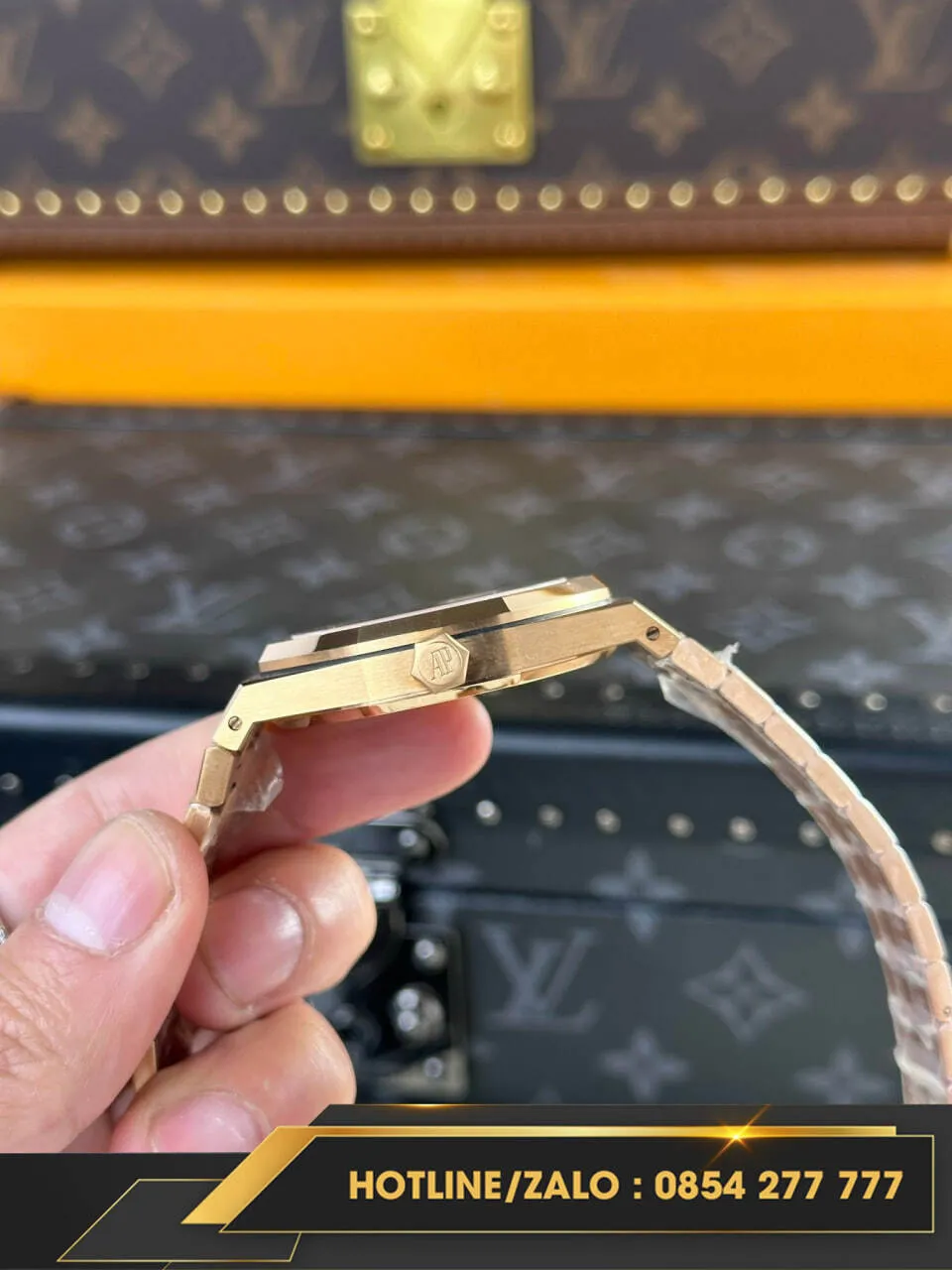 Đồng hồ Audemars Piguet replica Royal Oak 15400 vàng hồng là biểu tượng của sự sang trọng và đẳng cấp. Với kích thước 41mm, chiếc đồng hồ này tỏa sáng với vỏ và dây đeo bằng vàng hồng cao cấp, mang lại vẻ đẹp lộng lẫy và cuốn hút. Mặt số được hoàn thiện tinh xảo, kết hợp cùng các vạch số và kim chỉ giờ bằng vàng hồng, tạo nên sự hài hòa và tinh tế. Độ mỏng lý tưởng giúp đồng hồ ôm sát cổ tay, mang lại cảm giác thoải mái cho người đeo.