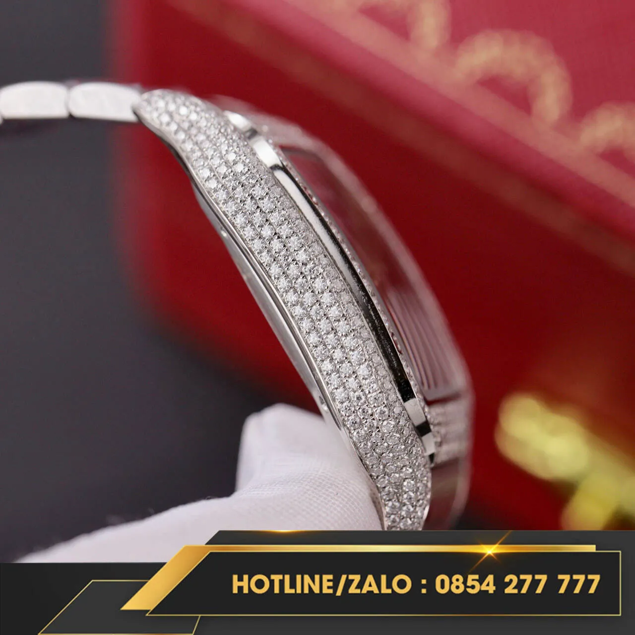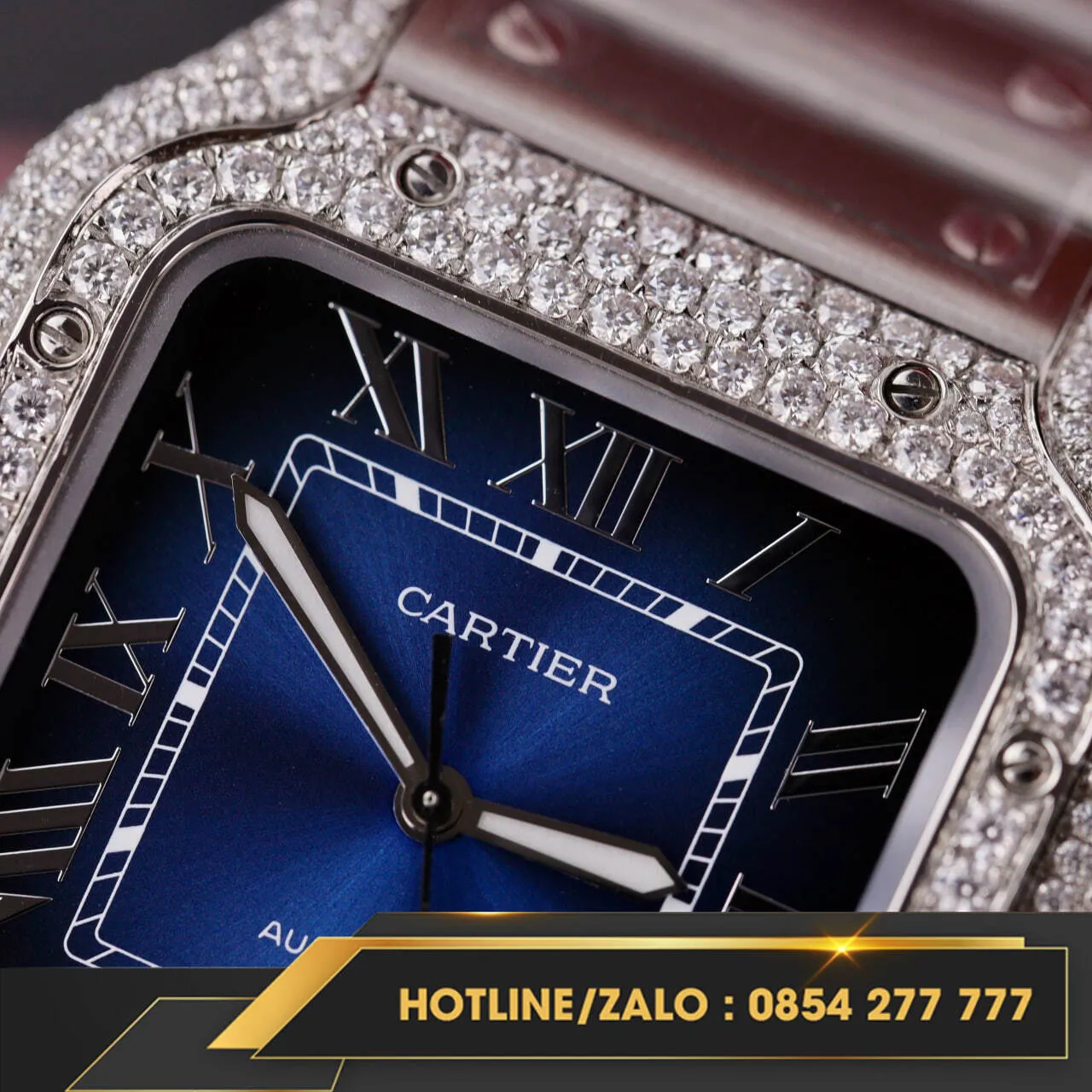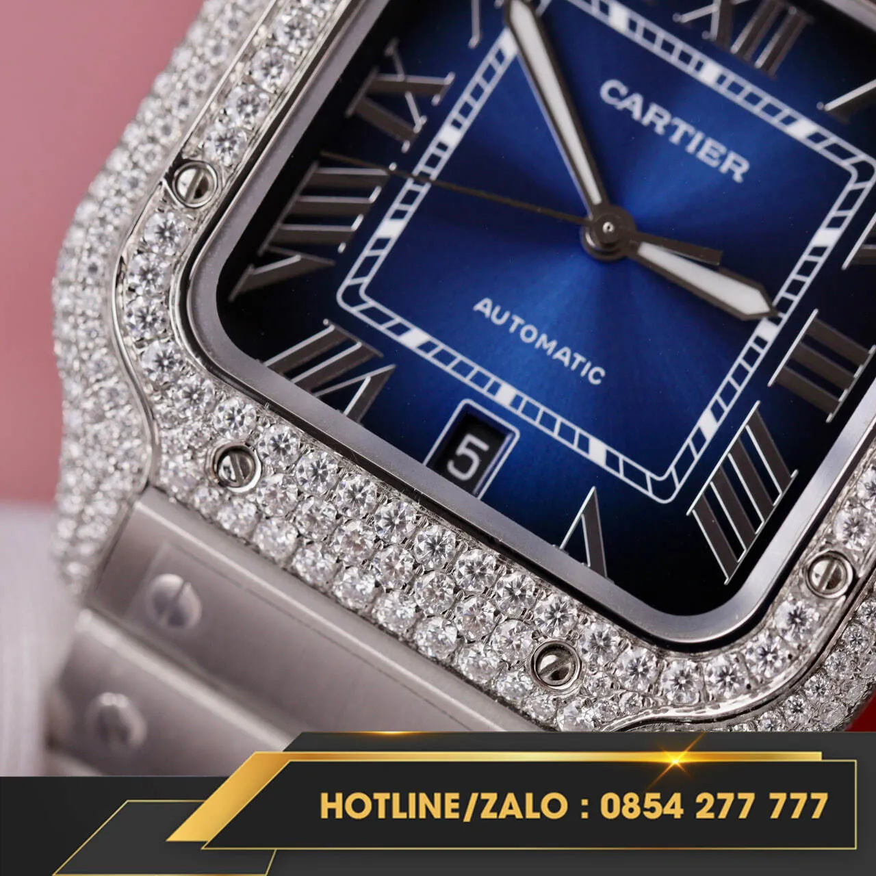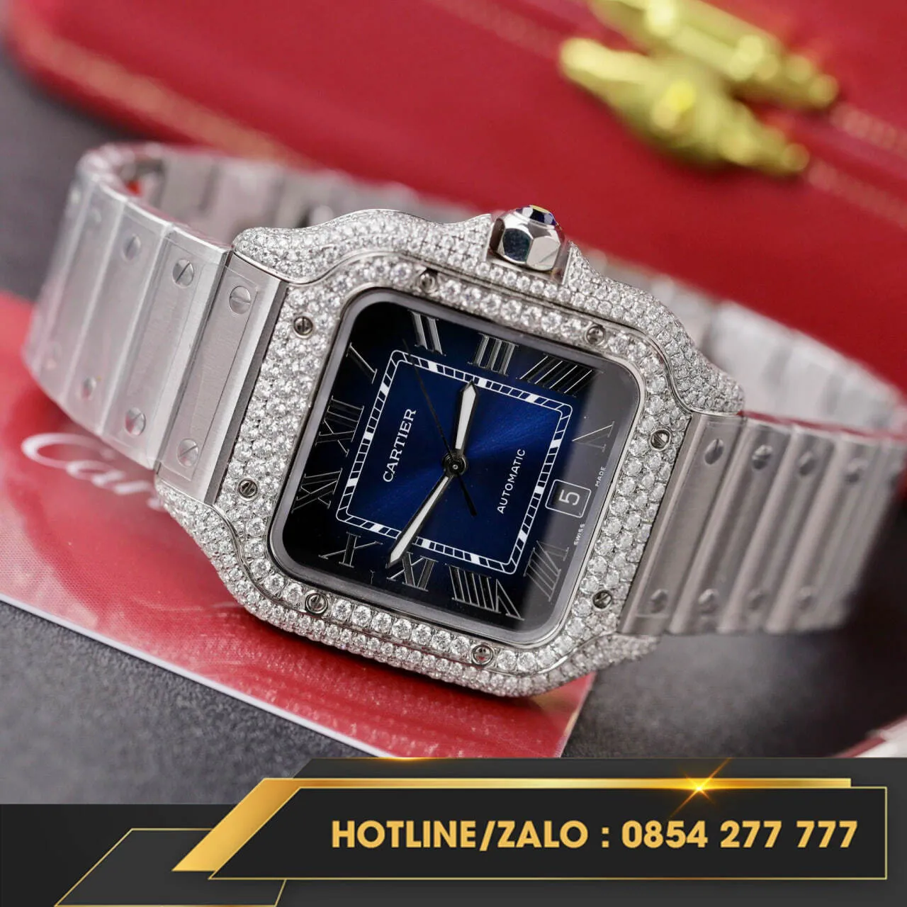 Đồng hồ Cartier Replica Santos Blue Dial viền độ moissanite là hiện thân của sự sang trọng và tinh tế. Với kích thước 40mm, chiếc đồng hồ này hoàn hảo cho cả phái mạnh và phái yếu, mang lại vẻ đẹp thanh lịch và đẳng cấp. Mặt số màu xanh dương đậm chất cổ điển được bảo vệ bởi lớp kính sapphire chống trầy xước, tạo nên sự hoàn hảo trong từng chi tiết. Viền đồng hồ được chế tác đầy tinh xảo với kim moissanite từ Hong Kong, tỏa sáng lấp lánh, tạo nên điểm nhấn đặc biệt và cuốn hút.