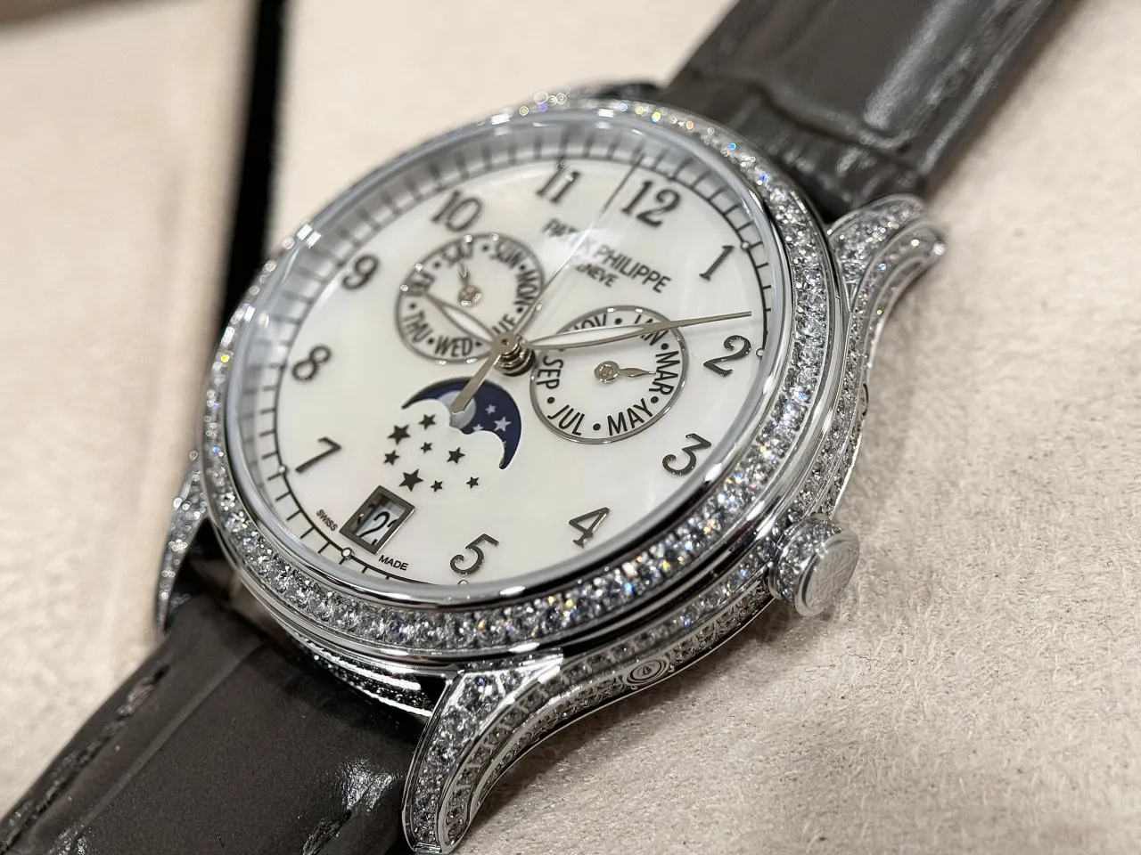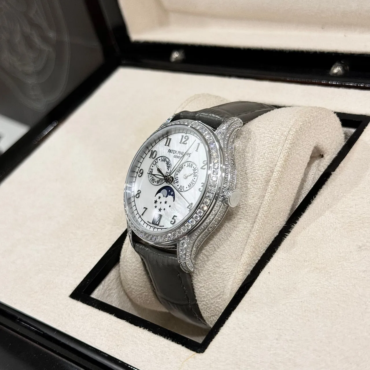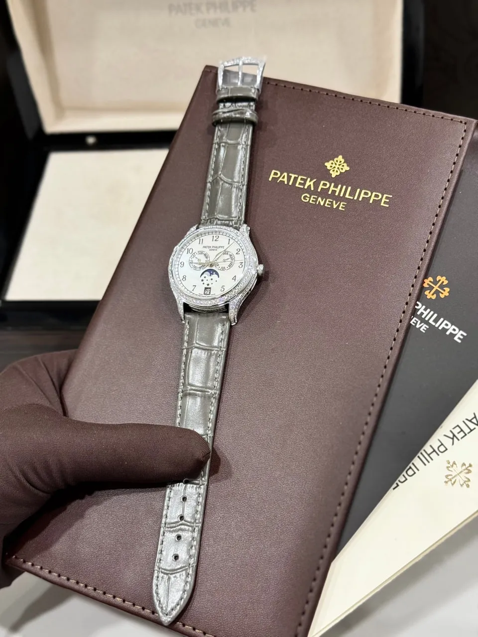Đồng hồ Patek Philippe fake 1:1 Complications 4947R-001 diamond sở hữu kích thước 38mm, mang lại sự thanh lịch và phù hợp với mọi cổ tay. Thiết kế mặt số được đính đá 4 chân cao cấp, đảm bảo tính vững chắc và lấp lánh, tạo nên vẻ đẹp lộng lẫy và quý phái. Dây đeo bằng da cá sấu lên fom aut không chỉ bền bỉ mà còn mềm mại, mang lại sự thoải mái tối đa cho người đeo.