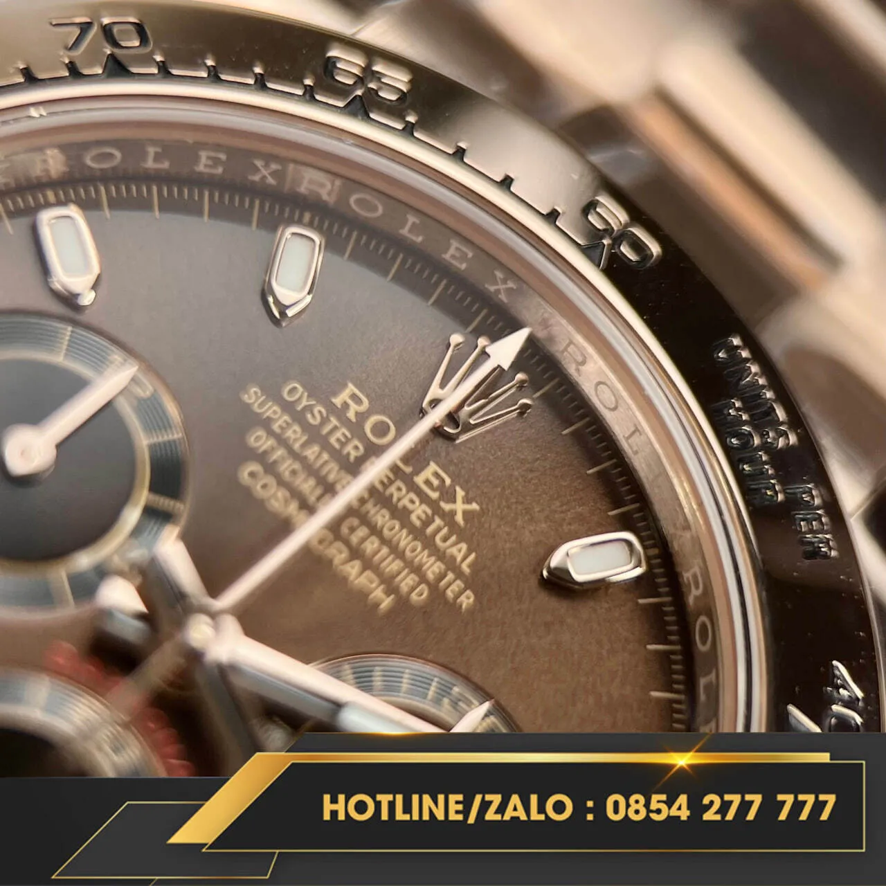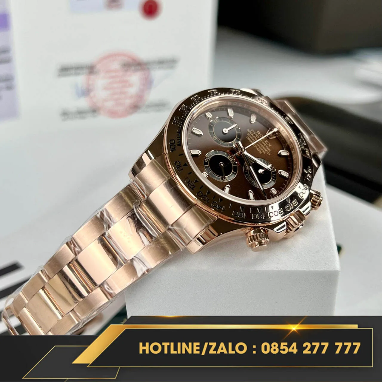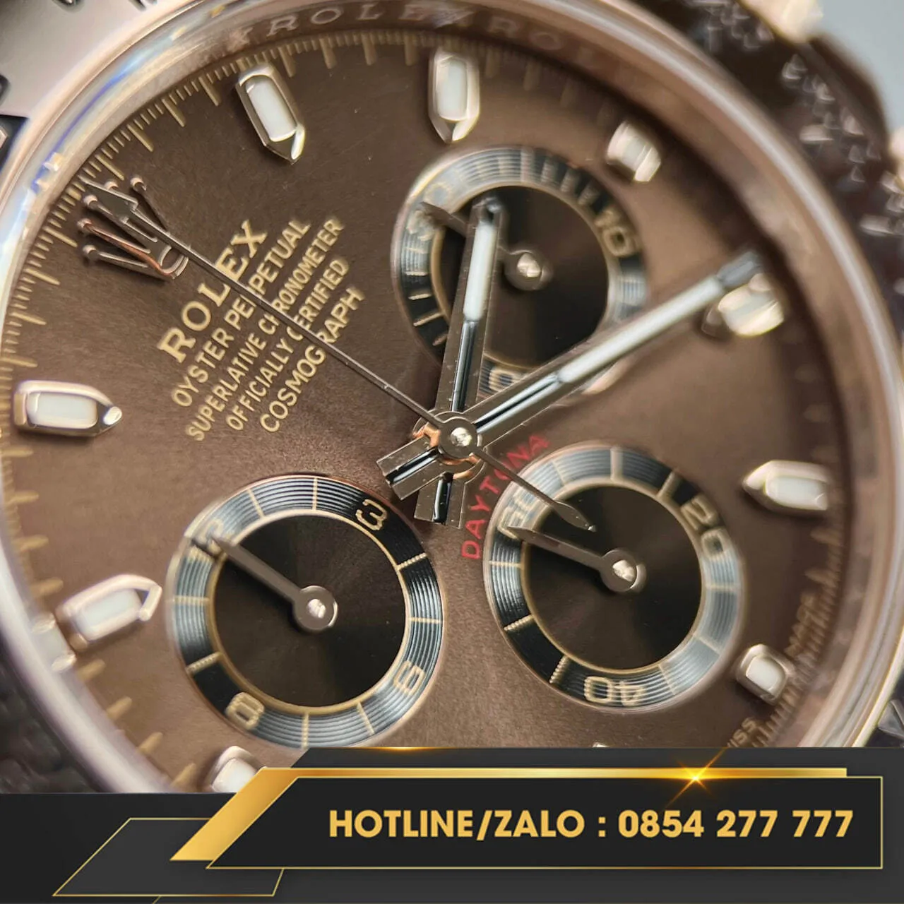 Đồng hồ Rolex Replica Cosmograph Daytona 116505 Chocolate Dial bọc vàng 18k mang đến vẻ đẹp sang trọng và đẳng cấp không thể chối từ. Mặt số màu chocolate kết hợp với vỏ và dây đeo bọc vàng 18k tạo nên một tổng thể hoàn hảo, vừa lịch lãm vừa nổi bật.