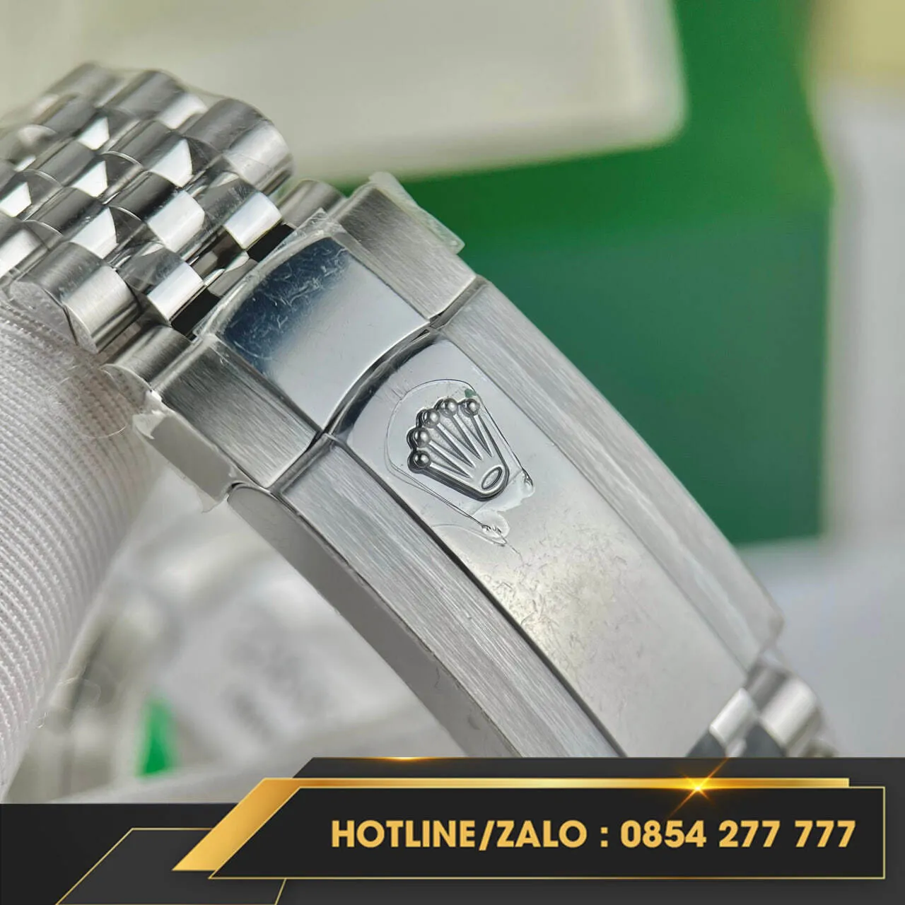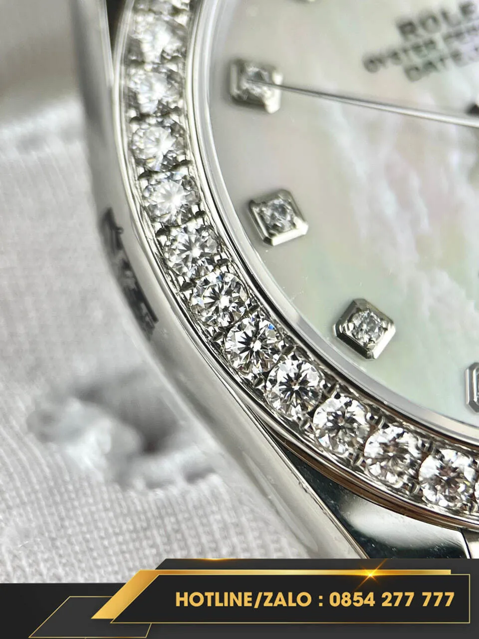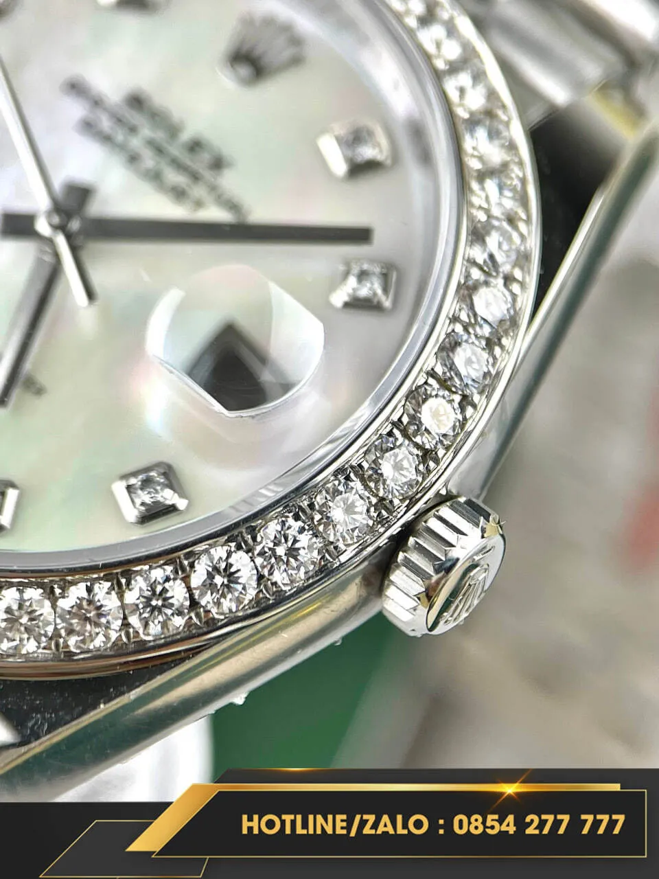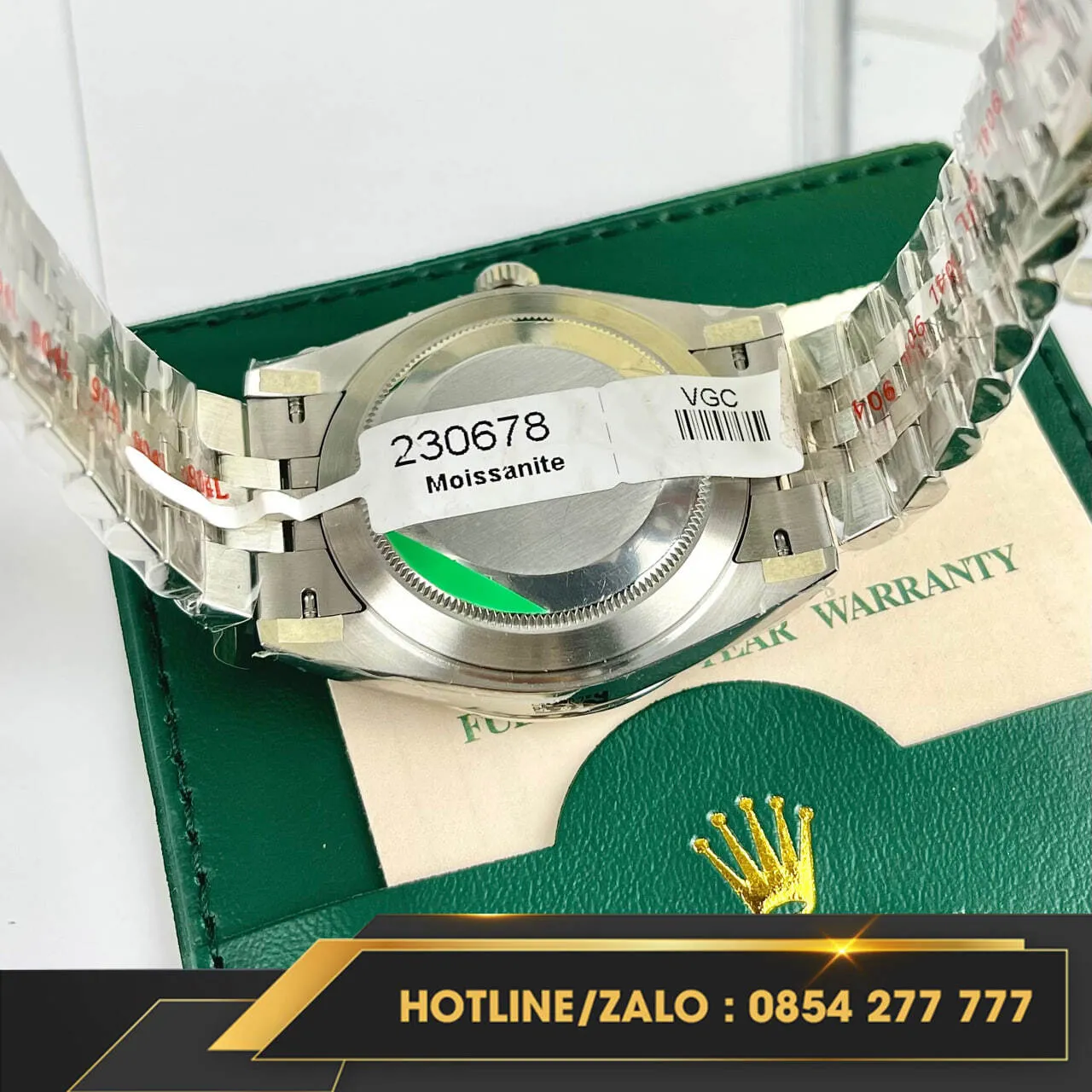 Vành moissanite của phiên bản này được chế tác tinh xảo với những viên đá 2.5 HongKong, tạo nên sự lấp lánh và quý phái cho đồng hồ. Mặt số MOP kết hợp với viền moissanite không chỉ làm tăng thêm vẻ đẹp sang trọng mà còn tạo nên một phong cách độc đáo và cuốn hút. Thương hiệu Rolex luôn là biểu tượng của sự đẳng cấp và phong cách, và chiếc đồng hồ này là minh chứng cho sự thành công và phong cách sống thượng lưu của chủ nhân.