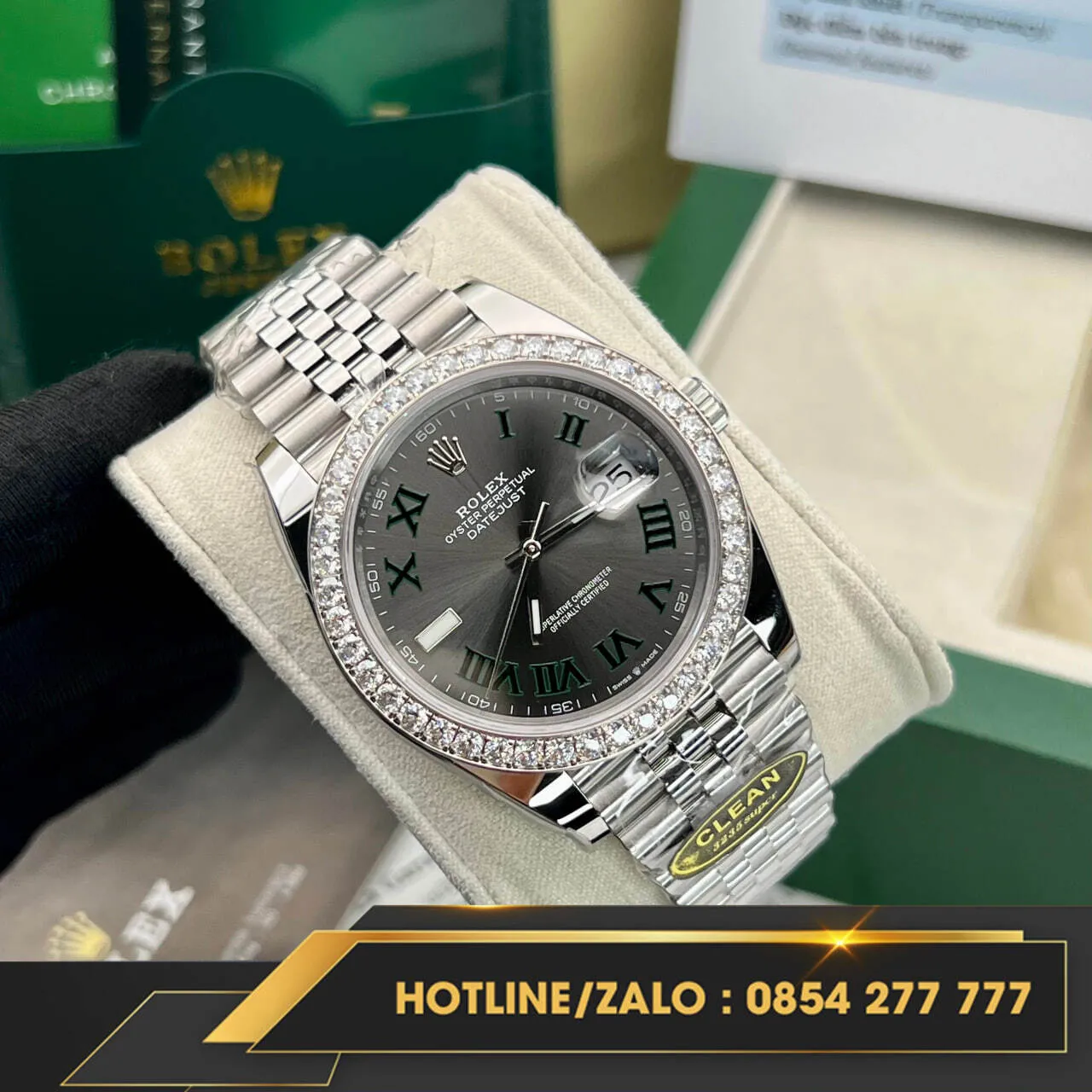 Đồng hồ Rolex rep 1:1 Datejust 41 Wimbledon 126334 viền moissanite là biểu tượng của sự hoàn hảo và đẳng cấp trong thế giới đồng hồ. Sử dụng thép không gỉ 904L, chiếc đồng hồ này không chỉ nổi bật với độ bền vượt trội mà còn mang đến vẻ sáng bóng hoàn mỹ, tạo nên một phong cách thời thượng và đẳng cấp. Với độ hoàn thiện chất lượng nhất từ nhà máy CLEAN, mọi chi tiết của đồng hồ đều được chăm chút tỉ mỉ, từ mặt số đến vỏ ngoài.