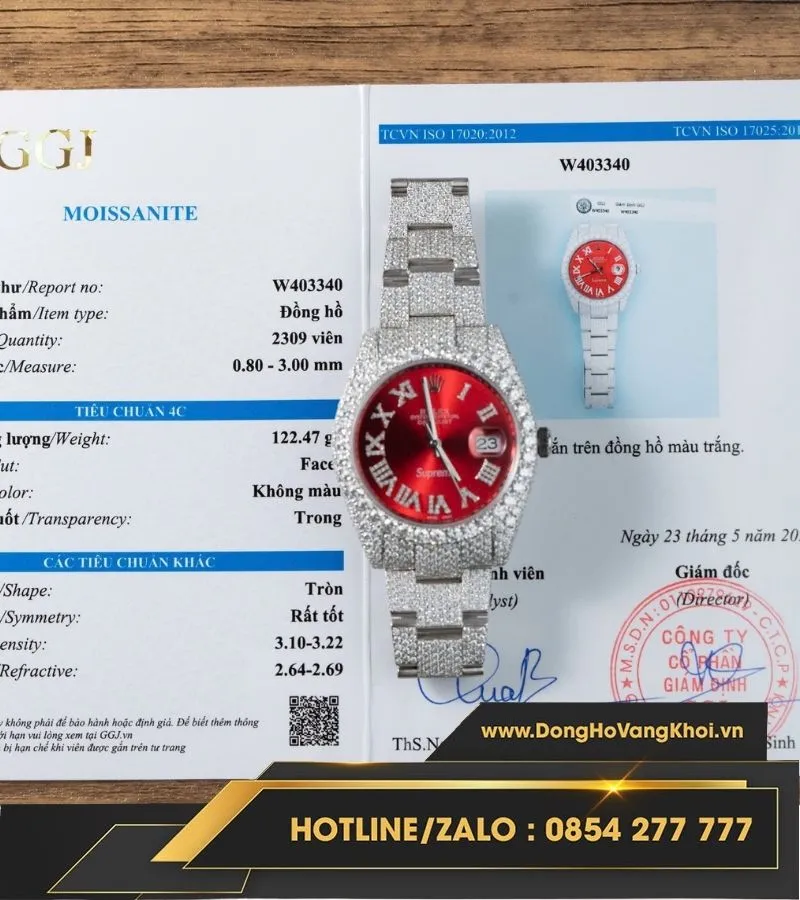 Sự tỏa sáng vượt trội: Moissanite được biết đến với độ tán sắc ánh sáng rất cao, mang lại khả năng lấp lánh và rực rỡ hơn cả kim cương, làm cho chiếc đồng hồ trở nên nổi bật hơn dưới ánh sáng.