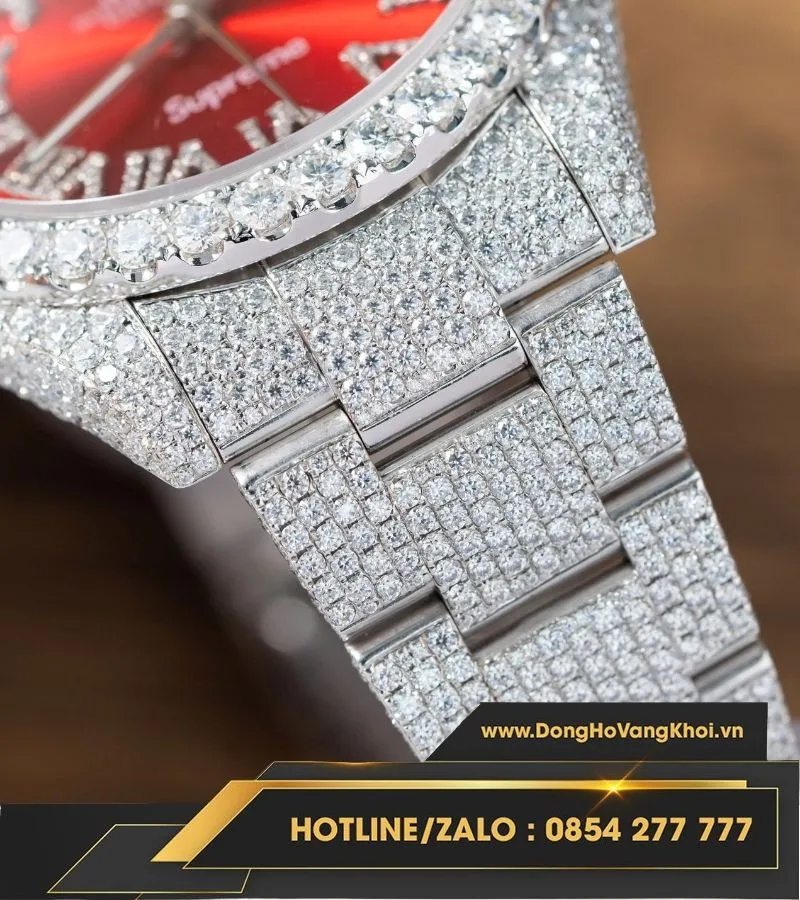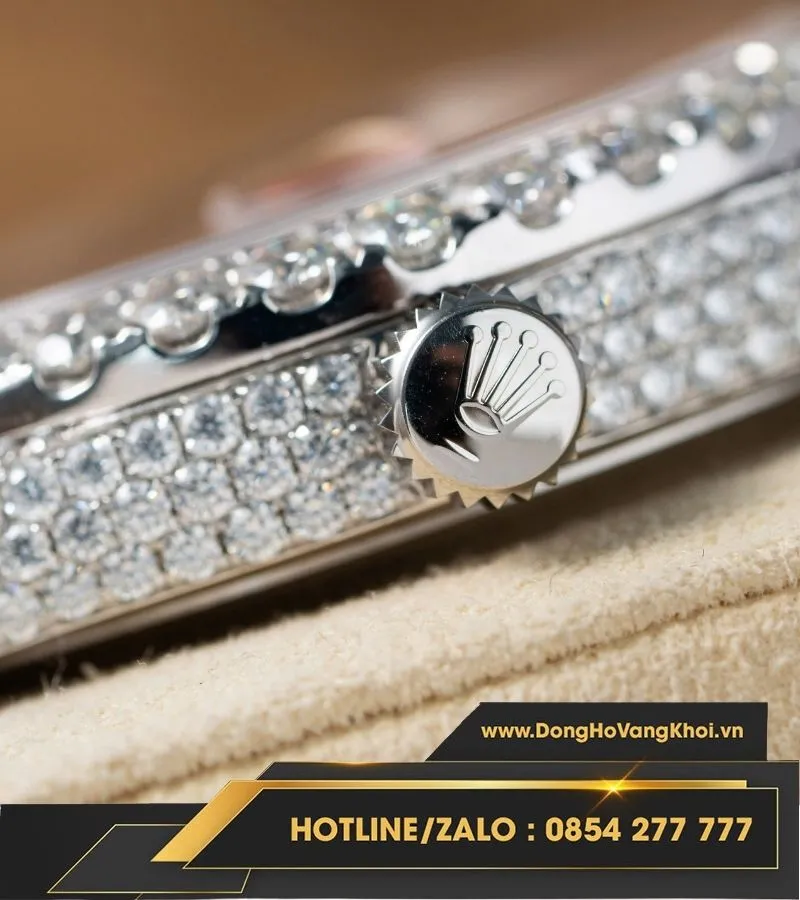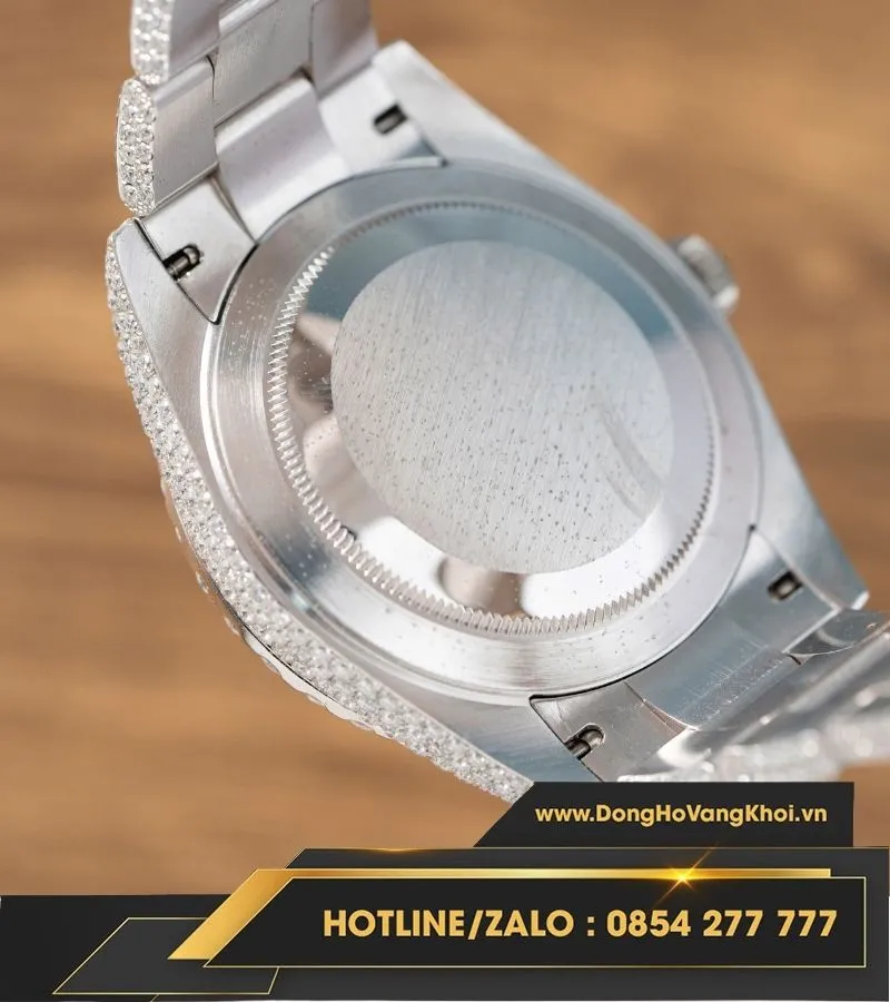 Full Moissanite: Một trong những điểm nổi bật của phiên bản replica này là việc toàn bộ đồng hồ, bao gồm bezel, mặt số và dây đeo, đều được đính đá Moissanite. Đây là loại đá quý có độ sáng lấp lánh gần tương đương với kim cương nhưng có giá trị thấp hơn rất nhiều. Moissanite giúp đồng hồ toát lên vẻ đẹp rực rỡ, cuốn hút và tạo sự khác biệt so với những chiếc đồng hồ khác.