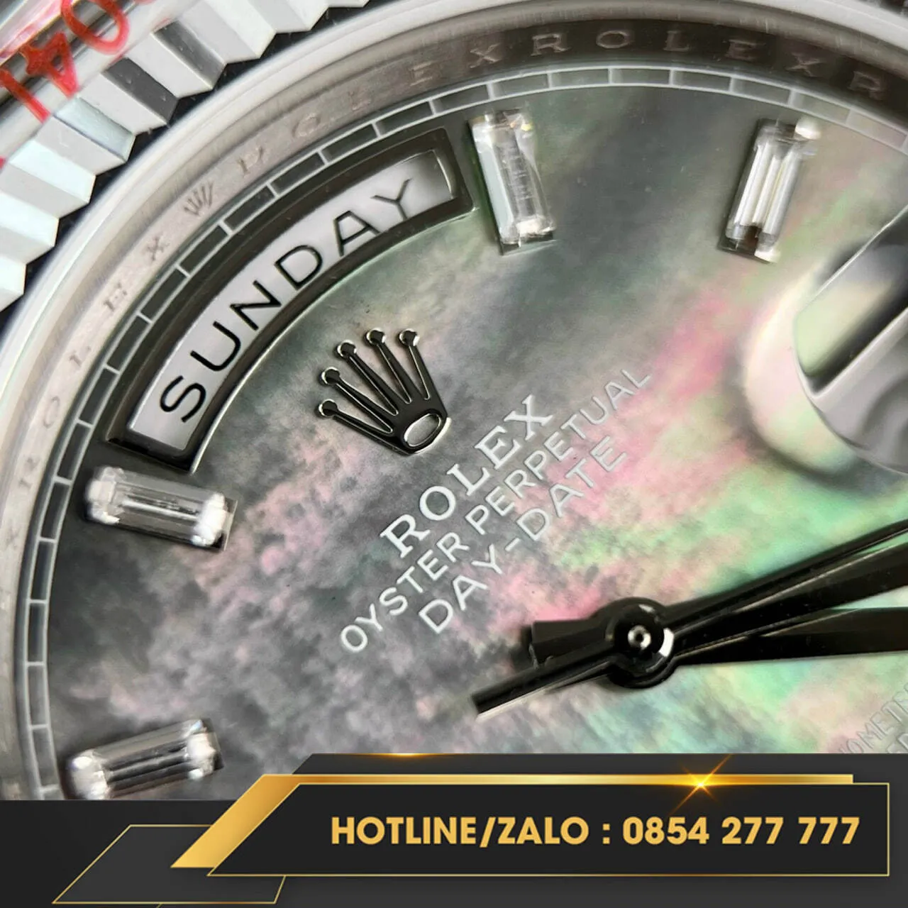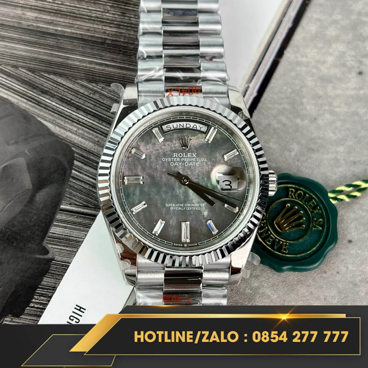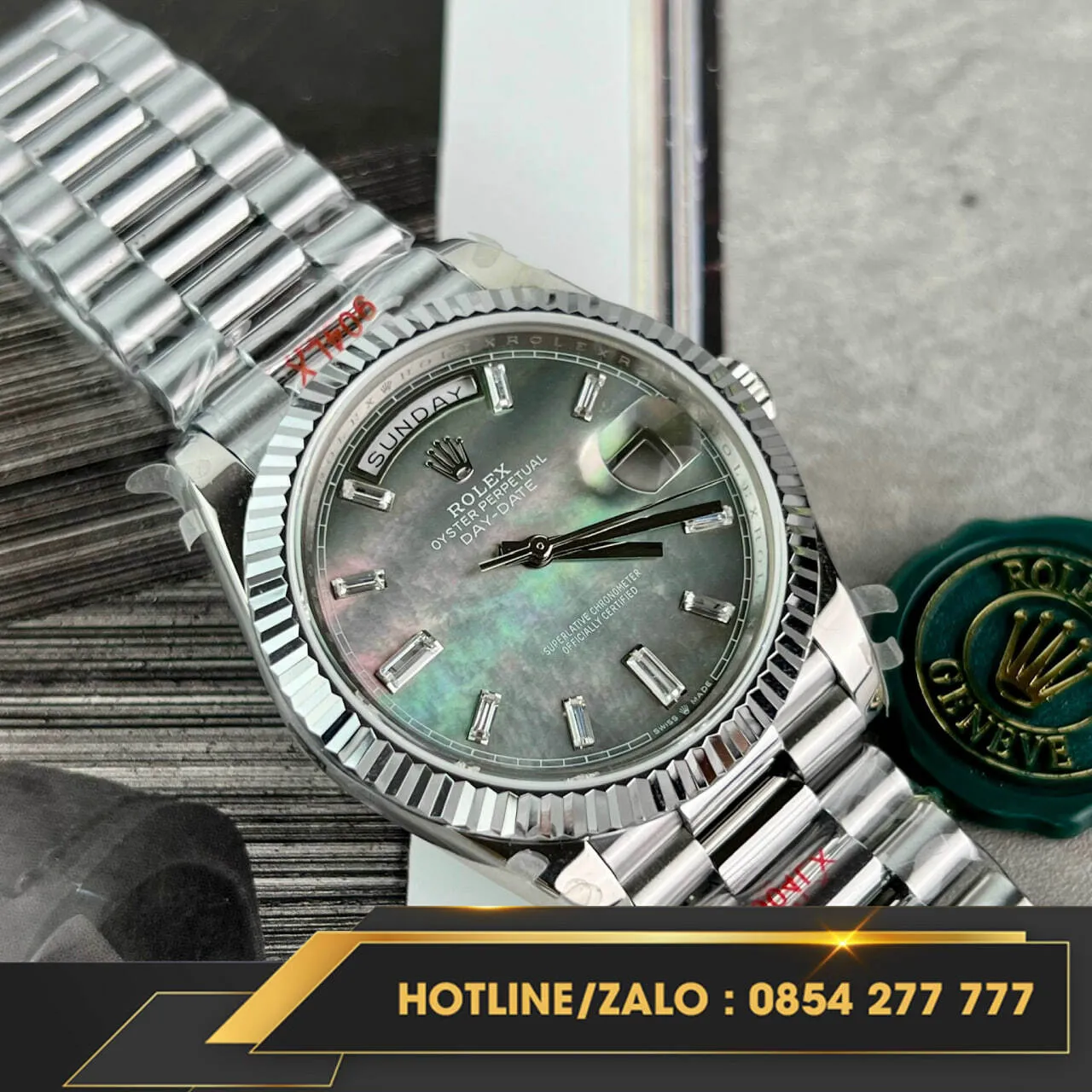 Đồng hồ Rolex Rep 1:1 Day-Date mặt xà cừ 175g nhà máy GM bản V3 mang đến thiết kế đẳng cấp và sang trọng. Mặt đồng hồ được làm từ xà cừ tự nhiên, tạo nên vẻ đẹp độc đáo và quý phái. Vỏ đồng hồ được chế tác từ thép không gỉ cao cấp, với kích thước và trọng lượng 175 gram, mang lại cảm giác đầm tay và chắc chắn. Các chi tiết trên mặt đồng hồ được hoàn thiện tỉ mỉ, từ các chỉ số giờ đến kim đồng hồ, tất cả đều toát lên sự hoàn mỹ và tinh tế.