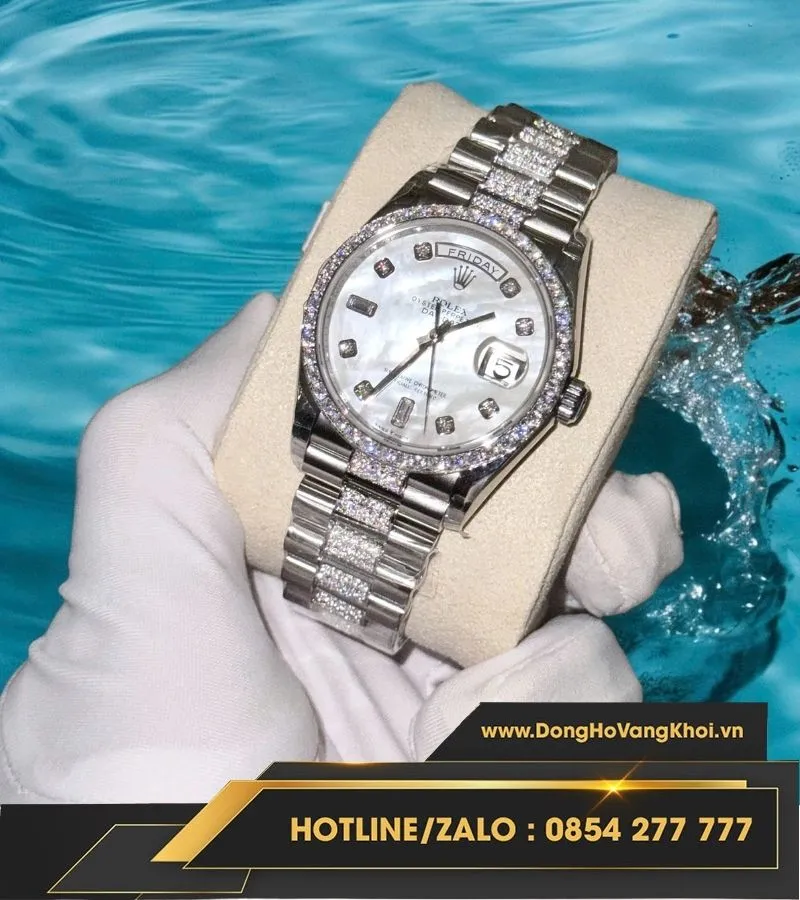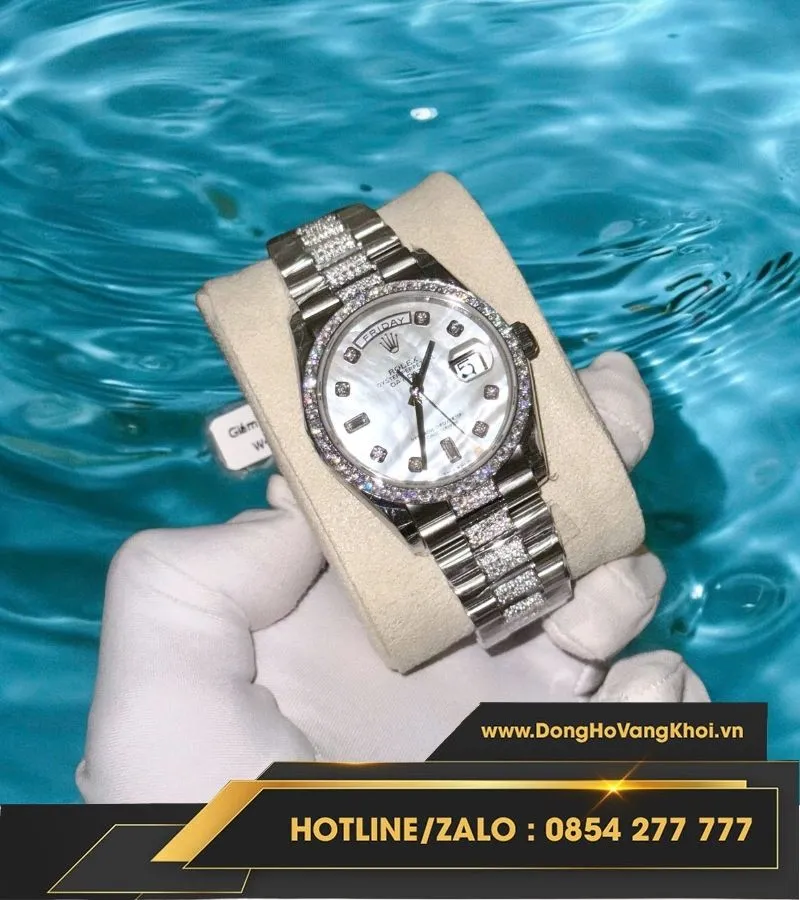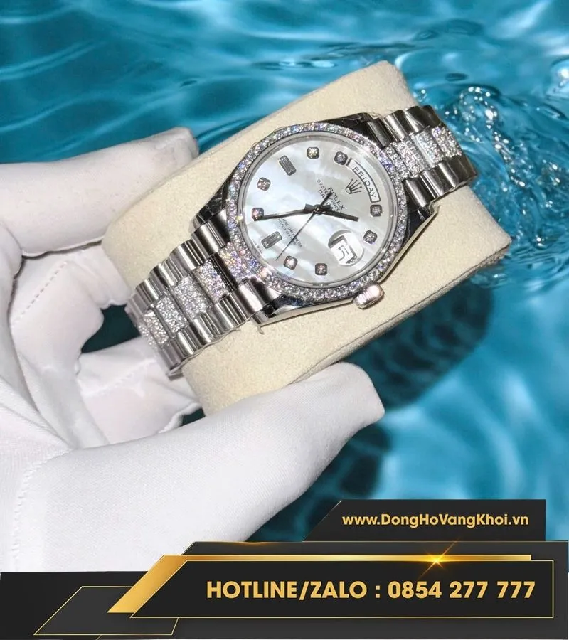 Đồng hồ Rolex Daydate 36 mặt mop tinh chỉnh độ kim cương