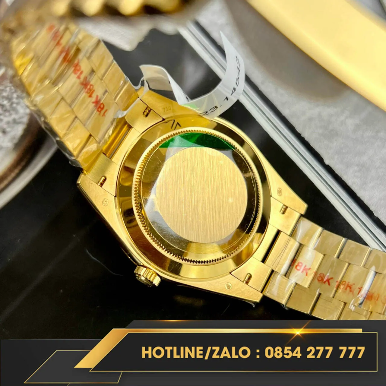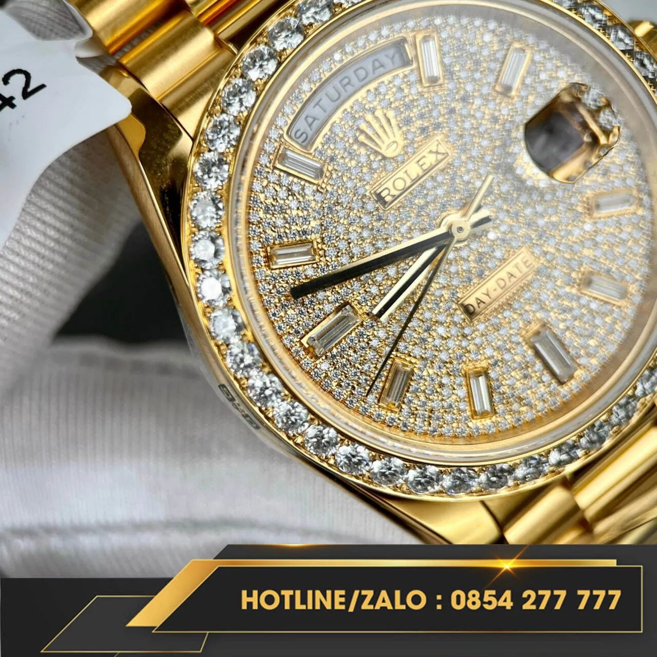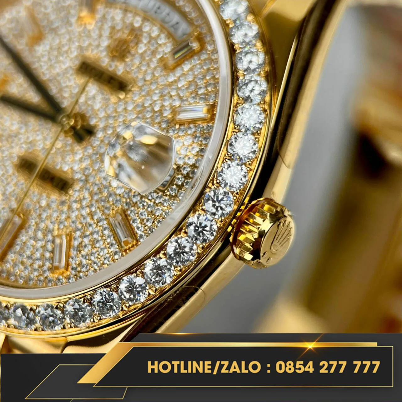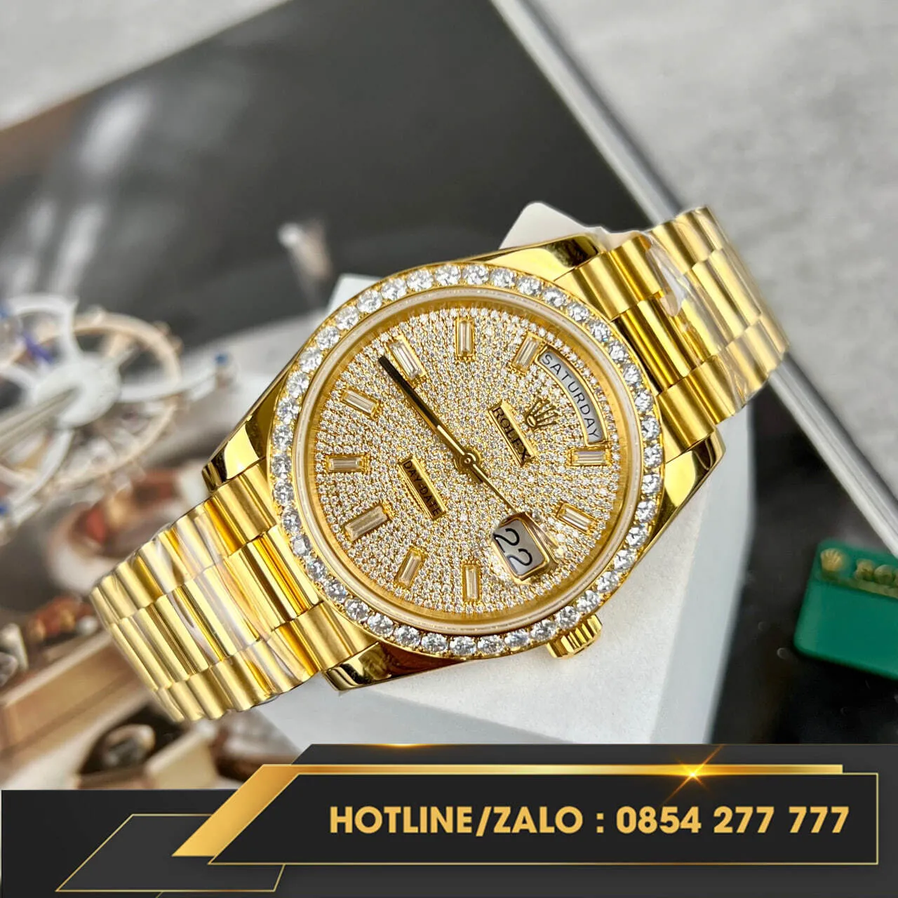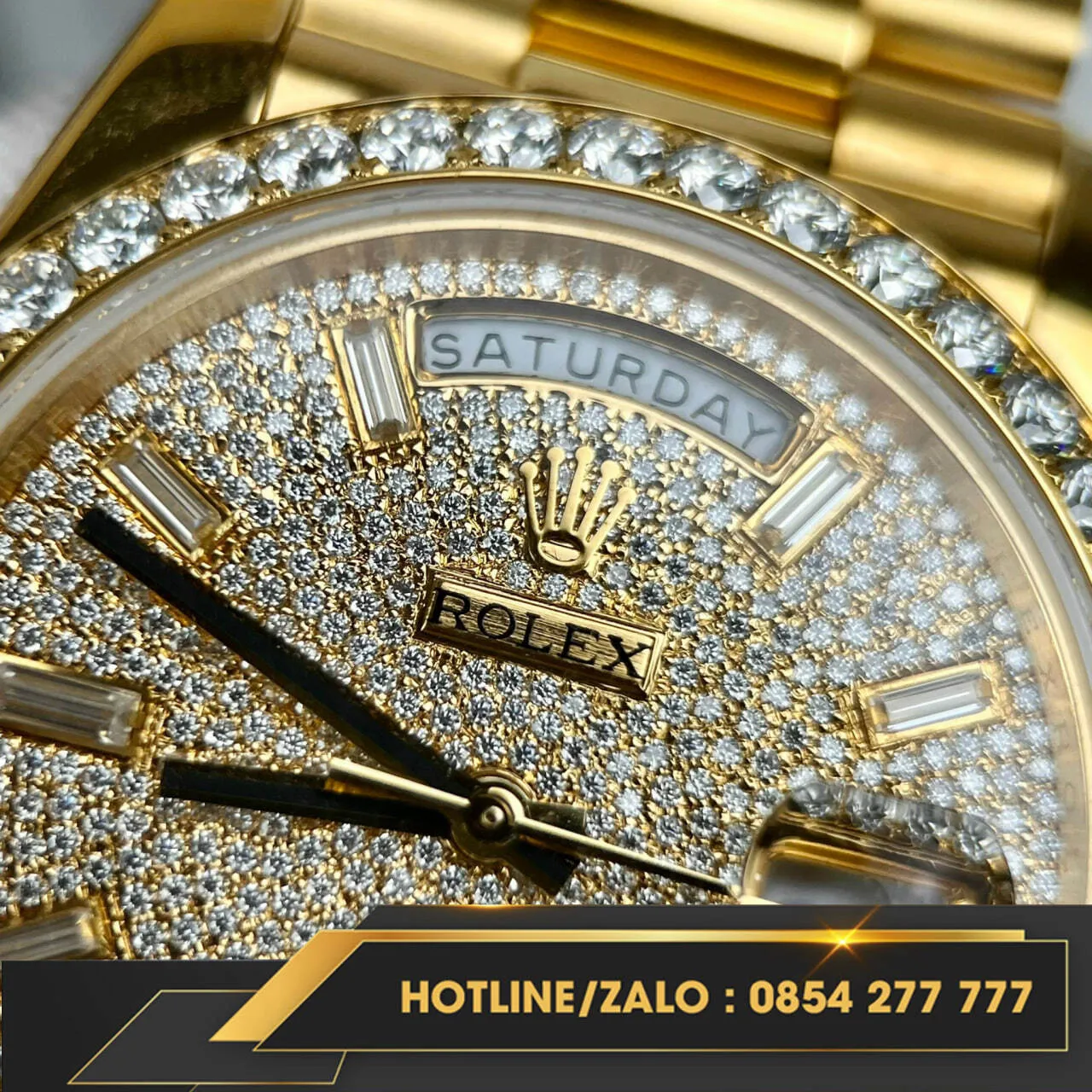 Hiện tại, Đồng hồ Rolex Day-Date bọc vàng V3 nặng 175g kim cương Moissanite đang có sẵn tại donghovangkhoi.vn. Liên hệ với chúng tôi ngay hôm nay để sở hữu cho mình chiếc đồng hồ đẳng cấp này.