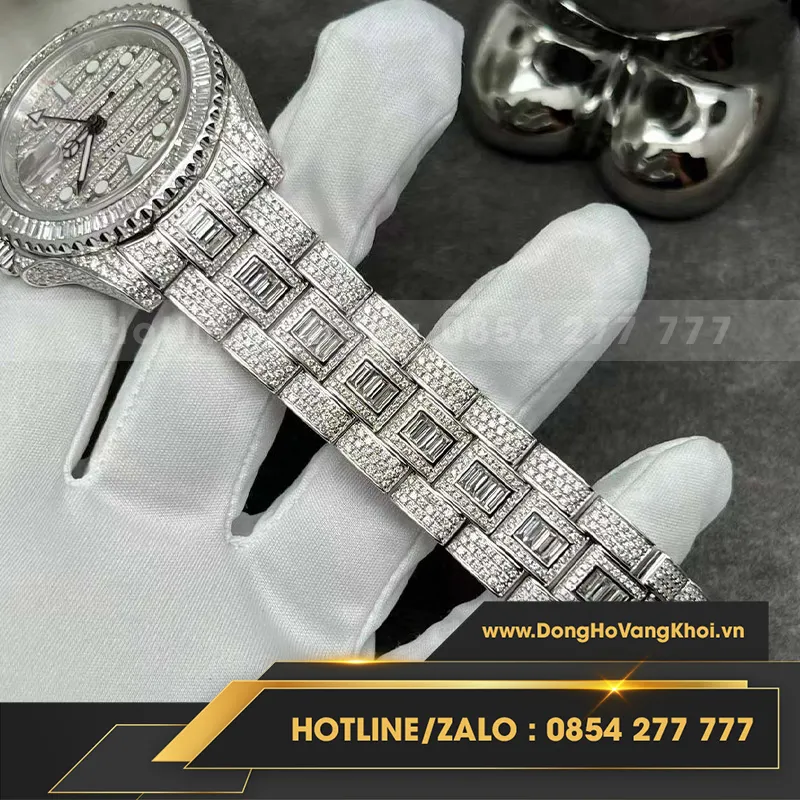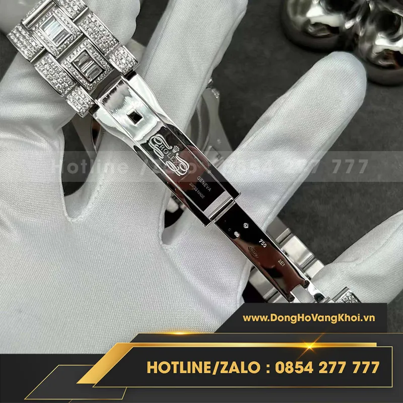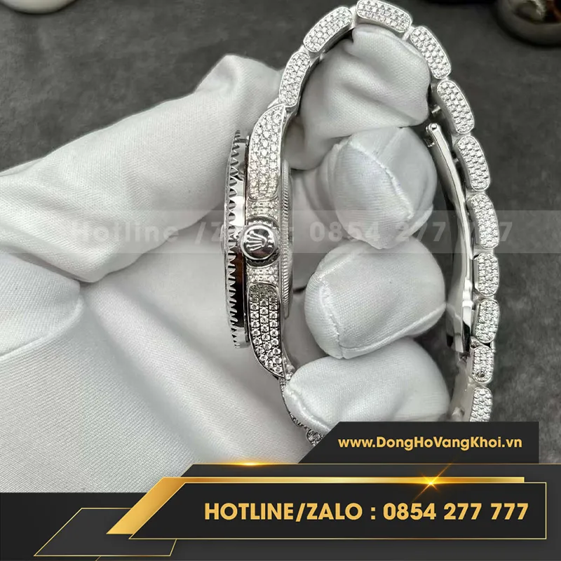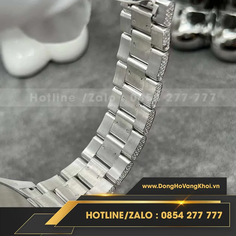 Bezel và mặt số của đồng hồ được đính kim cương thiên nhiên cao cấp, tạo nên vẻ ngoài lấp lánh, sang trọng và quyền lực. Việc đính kim cương được thực hiện cẩn thận, đảm bảo tính đồng nhất và hài hòa trong thiết kế, khiến đồng hồ vừa mang vẻ đẹp tinh tế, vừa thể hiện gu thẩm mỹ đẳng cấp của người sở hữu.